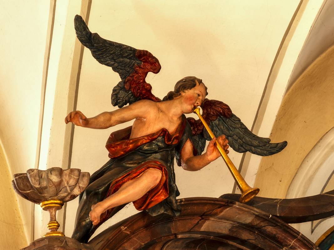 Außerhalb dieser „Pforte“ postierte der Künstler zwei irdische Boten der Christusverkündigung: