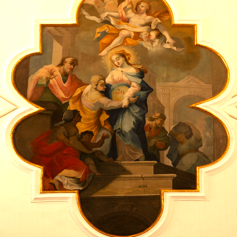 In den Seitenwänden öffnen sich korbbogige Fenster, drei rechts und zwei links, in den schrägen Apsis-Wänden und im schmalen hinteren je ein elliptisches Rundfenster nahe der Decke. Diese wölbt sich über den Raum, eingeschnitten durch spitze Seitengewölbe zu den Fenster hin.