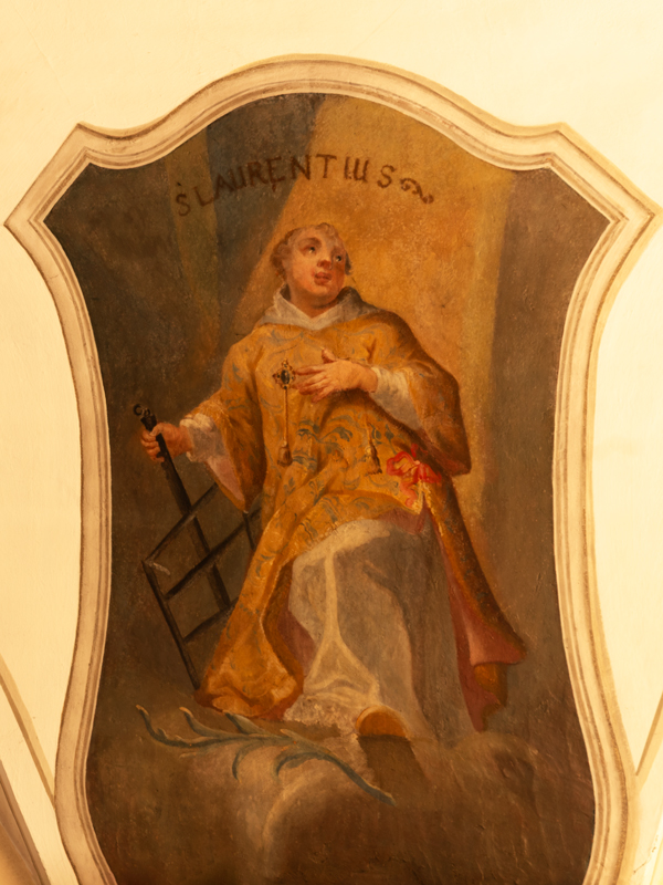 Laurentius († 258) (rechts), er wurde auf einem glühenden Rost hingerichtet. Nachdem er vor dem Kaiser Valentin „demonstriert“ hatte – „er führte alle Blinden, Lahmen und Notleidenden vor den Kaiser“ – fühlt der sich „bloßgestellt und ließ Laurentius auf einem glühenden Rost hinrichten. [Johanna Pölzl]“ Auf dem Foto sieht man nur den Schatten des Rostes.