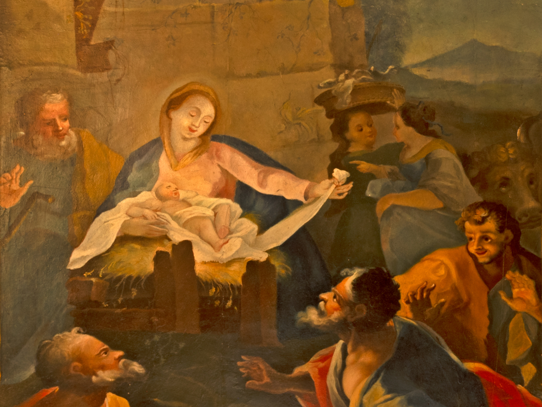 Im Zentrum des Gemäldes steht Maria aufrecht, vor ihr kniet Elisabeth, ihr Base und umfängt den Leib Marias.