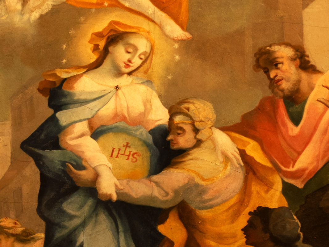 Der Blick Elisabeths richtet sich auf das Christusmonogramm, die griechischen Anfangsbuchstaben des Namen Jesus IHS.