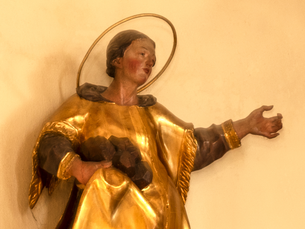 Stephanus († um 36/40 n.Chr.) (links), der erste christliche Märtyrer, mit Steinen in der rechten Armbeuge: Er wurde in Jerusalem um 36/40 n.Chr. gesteinigt.