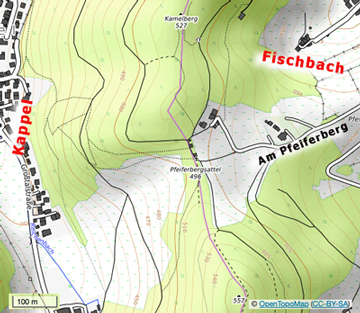 Der Pfeiferbergsattel liegt zwischen dem Kamelberg (527m) und dem Hercherberg (557m) und bildet einen Übergang vom Großtal (Kappel) zum Zartener Becken (Kirchzarten-Neuhäuser).
