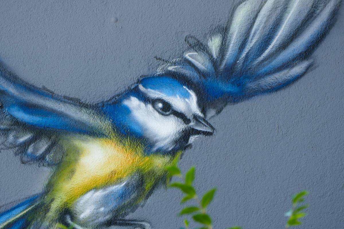 Die Fassade des Jugendzentrums zur Zartener Straße hin wurde im Rahmen eines Azubi-Projekts des Malerfachbetriebs Schweizer und der Firma db-Werbeartikel neu gestrichen. Auf diesem Neuanstrich schuf Michael Genter – damals Mitarbeiter von db-Werbeartikel – ein ausdrucksstarkes Graffiti: das Wappentier von Kirchzarten, ein Bär, und einee Blaumeise mit weitem Flügelschlag – jugendlich bunt.