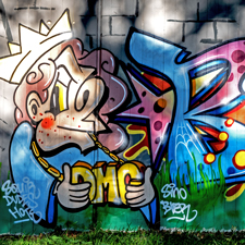 Dort, wo die Brugga in die Dreisam fließt, verlässt der Dreisamradweg FR1 die Dreisam und überquert kurz danach die Brugga. Anschließend begleitet sie den Dreisamradweg auf seiner rechten, westlichen Seite. Linkerhand führt der Weg dann vorbei an der Wand des östlichen Widerlagers der B31-Brücke, die hier die Brugga und den Radweg überspannt, und an einigen Meter der anschließende Stützmauer der B31. Beides einladende Wände für Graffitis. Besonders die längere Stützmauer, da sie viel Fläche bietet und im Freien liegt und nicht im Schatten der Brücke.