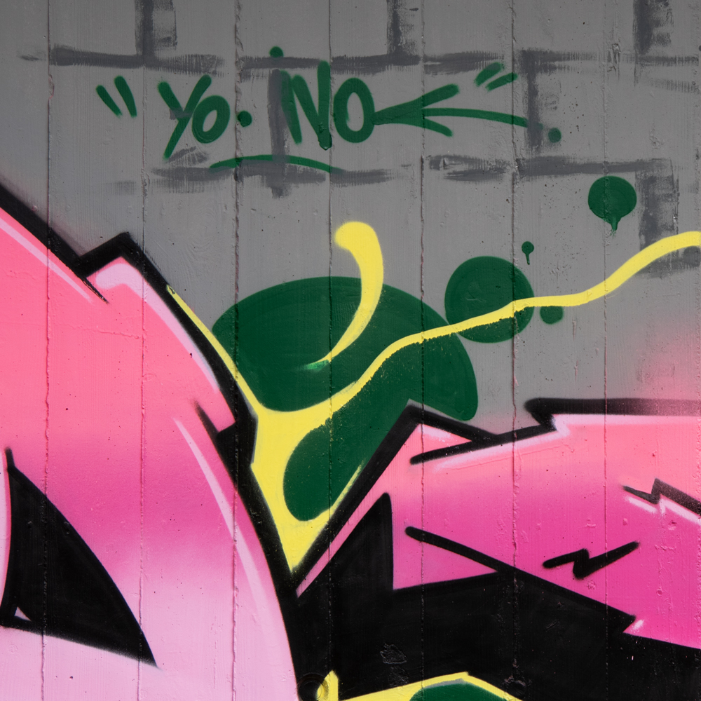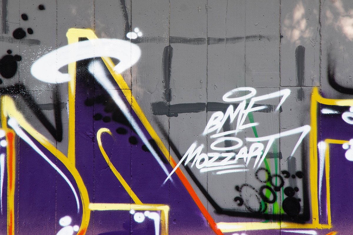 Die zweite 2020-Serie der Stützmauer-Aufnahmen zeigt die Graffitis bei gleichmäßig fahler Tagesbeleuchtung: Die Farben wirken fahler, die Kontraste sind geringer.