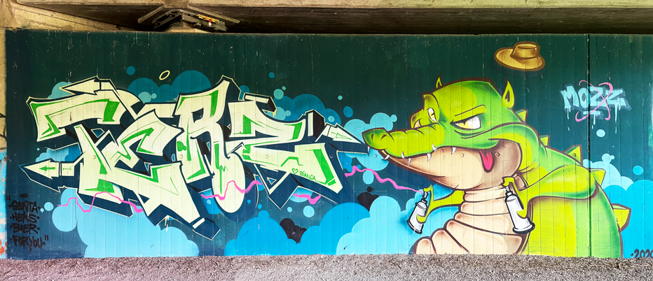 Unter der Brücke ein Schriftkompositionen (Style-Writing) mit einer farb-sprühenden Fabel-Echse.