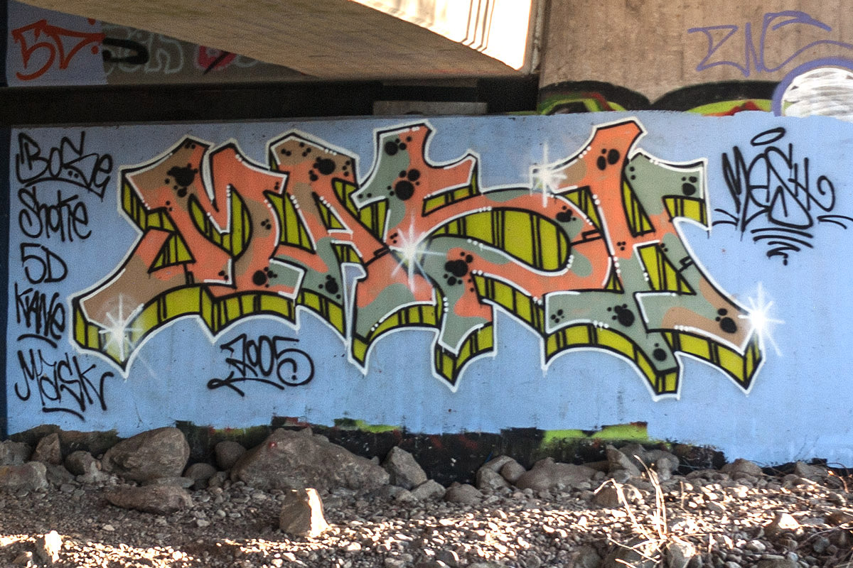 Als Graffiti-Fläche werden häufig die Wände von Bückenwiderlagern genutzt. Die Spannbetonbrücke, welche die Stegener Straße (Teilstück der L127), zwischen Kirchzarten und Stegen über die junge Dreisam führt, bildet da keine Ausnahme: Das südliche Brückenwiderlager ist Hintergrund von drei verschiedenen Graffiti-Gestaltungen.
