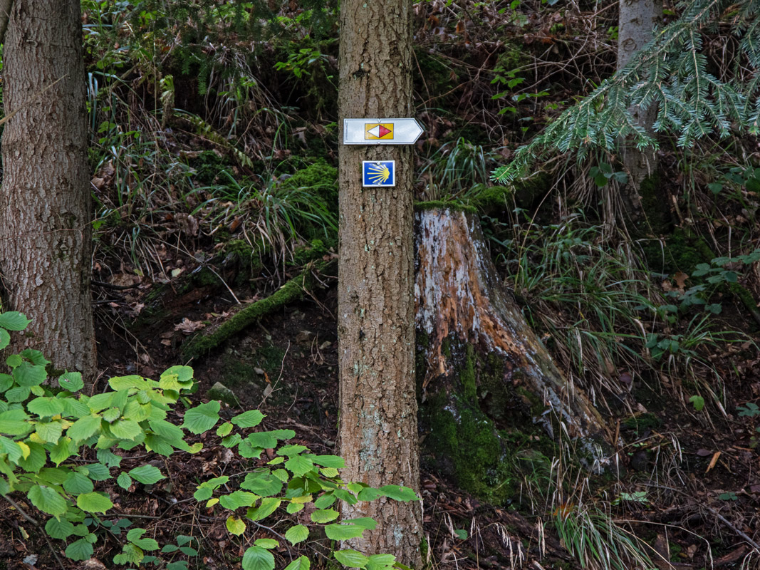 Gelbes Signet auf blauem Grund: Wander-strecke eines Jakobswegs – Abschnitt Himmelreich-Freiburg