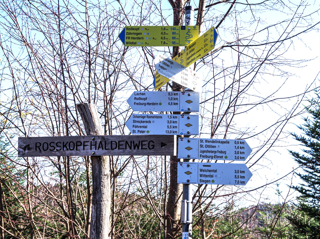 Der auf den Fotos, oben und rechts, sichtbare Weg trägt den Namen Roßkopfhaldenweg. Er kommt aus dem Dreisamtal und beginnt knapp über der Jugendherberge Freiburg und führt hinauf zum Kamm zwischen dem Glasbachdobel und dem St. Ottiliendobel.
