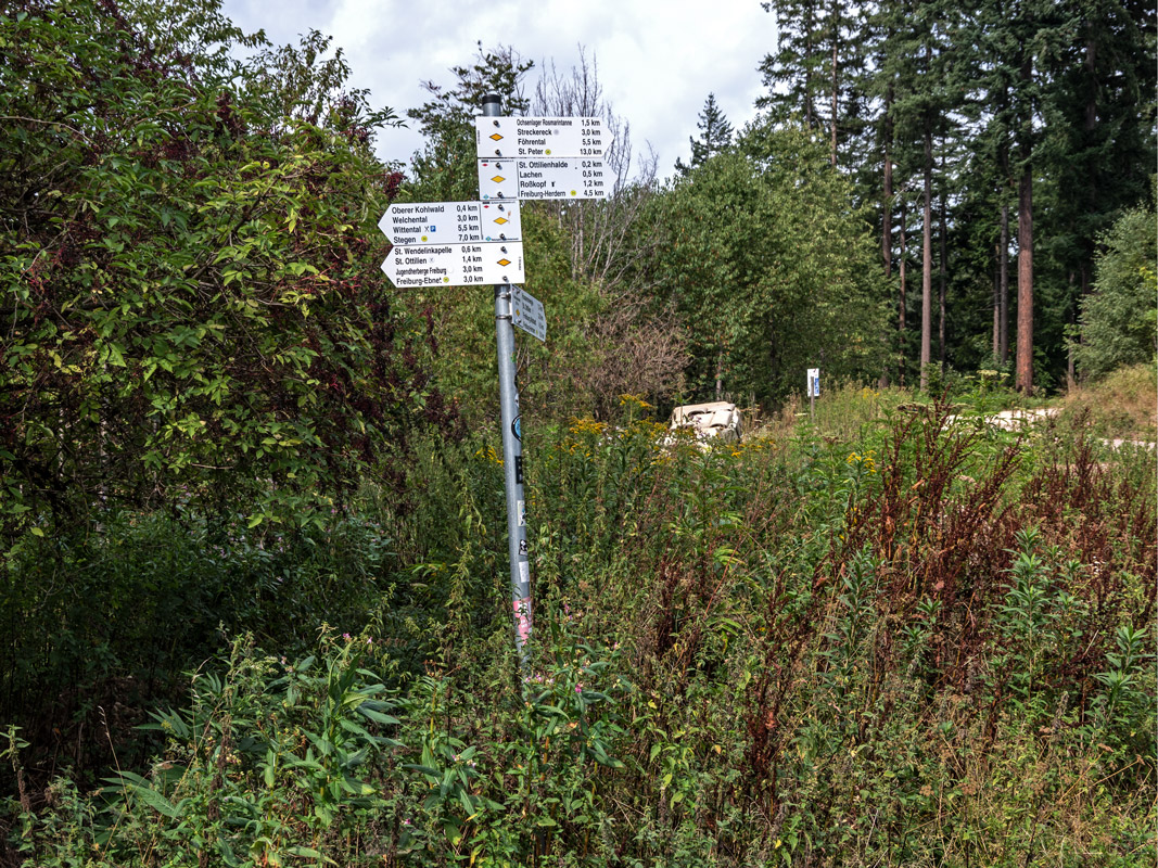 Der Wegweiser auf dem rechten Foto steht auf der Sattelseite, die zum Ottiliendobel (Musbachtal) abfällt.