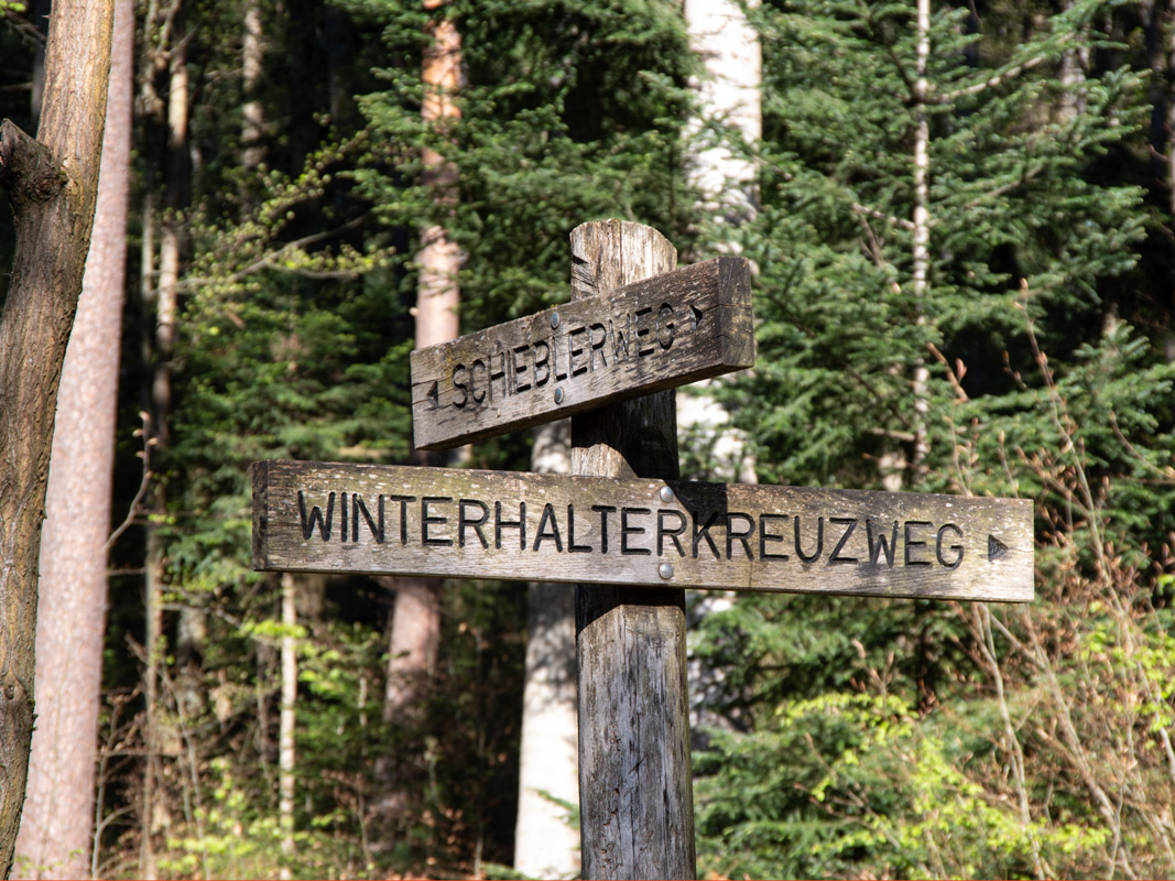 Der Wegweiser an der Abzweigung des Winterhalterkreuzweg vom Schieblerweg. / Das 2022 neu aufgestellte Winterhalterkreuz. / Blick den Winterhalterkreuzweg aufwärts: Hier hinauf geht die Wanderung weiter.