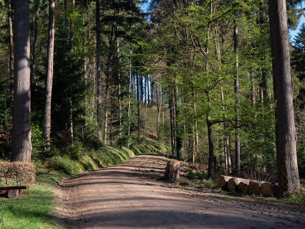 Bis hierher kann man auf geteertem Weg mit dem Fahrrad hinauffahren, es am Schutzgitter anschließen, um dann zu Fuß auf dem Pfad links vom (linken) Schild „absolutes Halteverbot“ in den Dobel hinein zu wandern.
