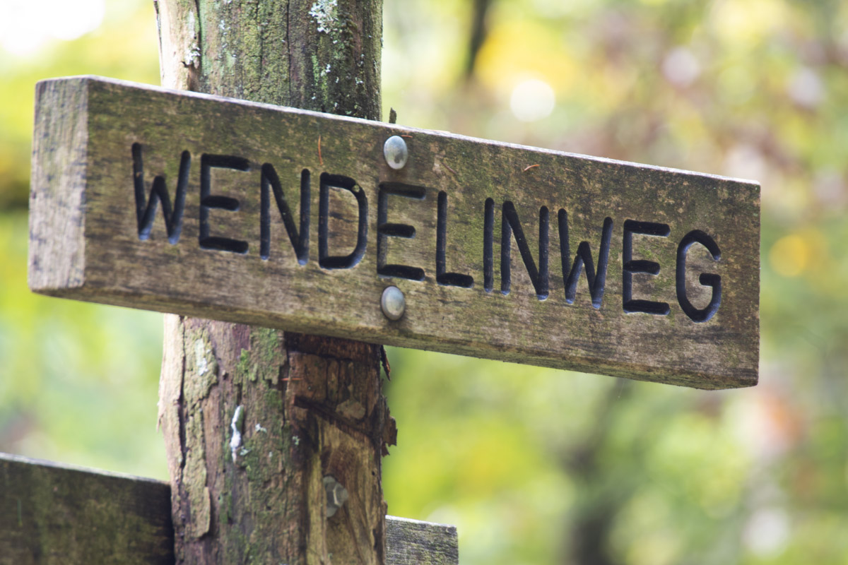 Blick vom St. Wendelinweg auf die Kapelle und den Wegweiser vor dem Kapellengelände. Der Eingang der Kapelle liegt auf ihrer Südseite.