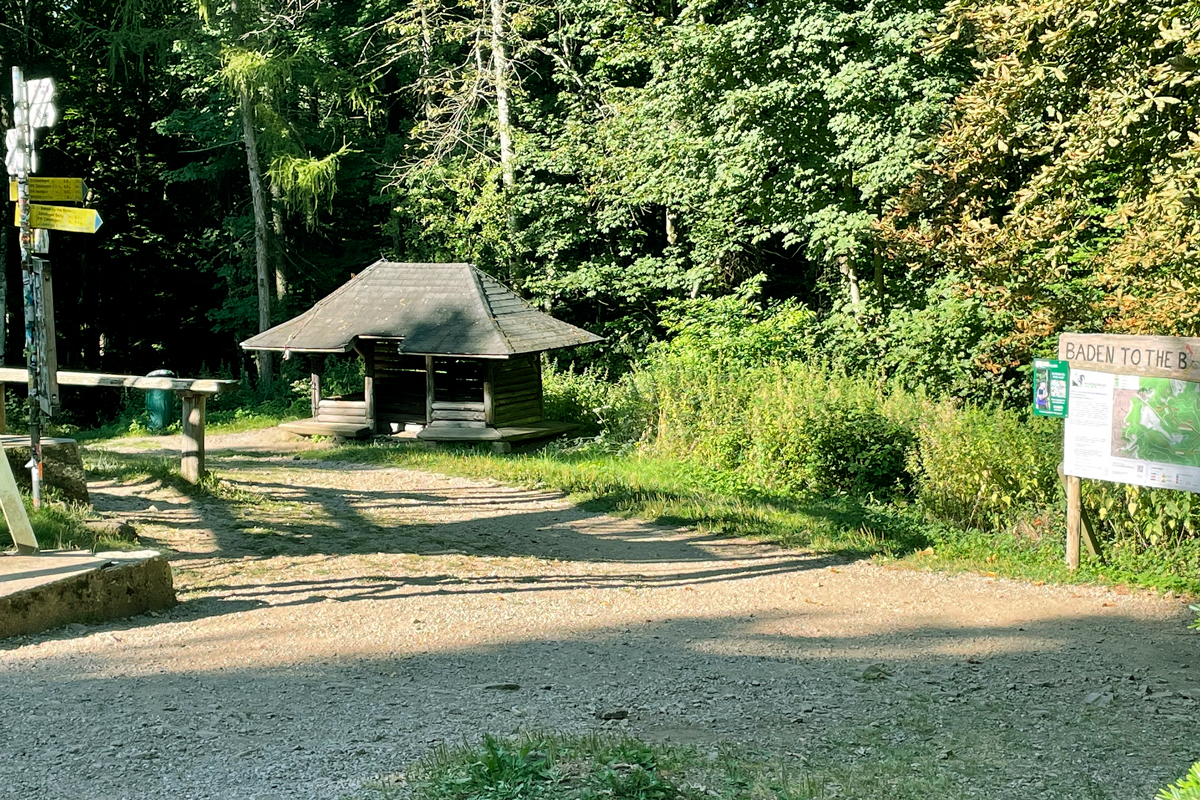 Nimmt man sich etwas Zeit kann man vom Forstweg aus, wenn man ihn etwas bergab folgt, ins Musbachtal schauen. Am gegenüberliegenden Hang fällt die abschließende Station der Kreuzweg hinauf zur Wallfahrtskirche auf. Blickt man den Weg zurück sieht man die Front der Gaststätte.