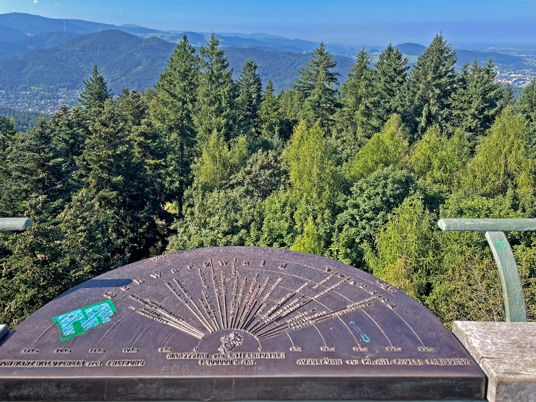 Foto links: Über die Info-Tafel und den umgebenden Wald hinweg reicht der Blickwinkel vom Schauinsland bis zu den Vor-bergen Schönberg (645m) und Schneeberg (512m), davor Merz-hausen.