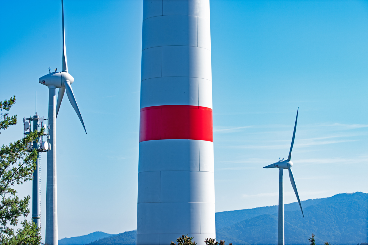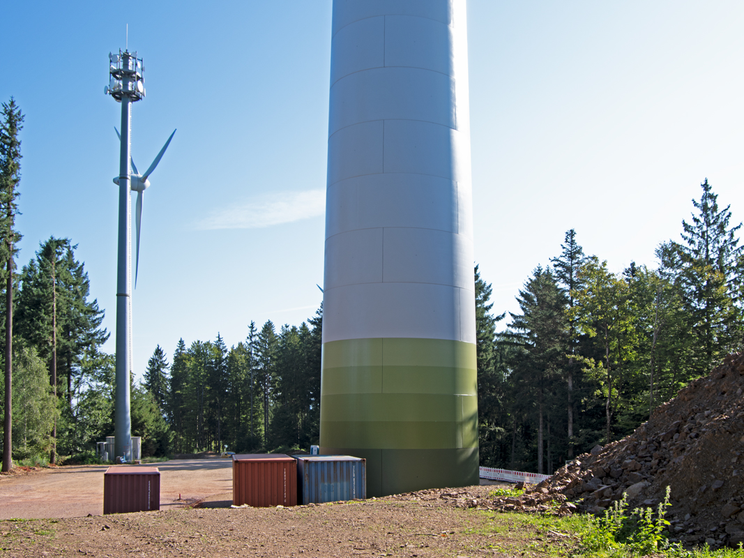 Repowering der Windenergie-Anlage Roßkopf: zwei der alten, noch stehende Windräder aus dem Jahr 2003 und der Betonturm eines neuen Windrads. Er steht am Platz eines schon gesprengten alten Windrads. Unbeteiligt der Funkmast, ganz links im Bild.