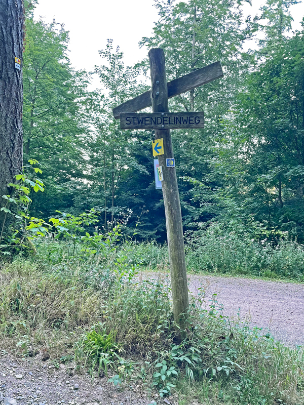 Der Pfad hinunter zur Wallfahrtskapelle quert einen Forstweg. Es ist der „Obere Abfuhrweg“, den man beim Aufstieg – Abzweigung zum „St.Wendelinweg“ – schon einmal überquert hat. Danach überquert man einen weiteren, schmaleren Weg, den Schokoladenweg: An einem ebenfalls durchlöcherten, jedoch rindenlosen Baumstamm ist eine Wegmarkierung angegeben, dieser folgt man.