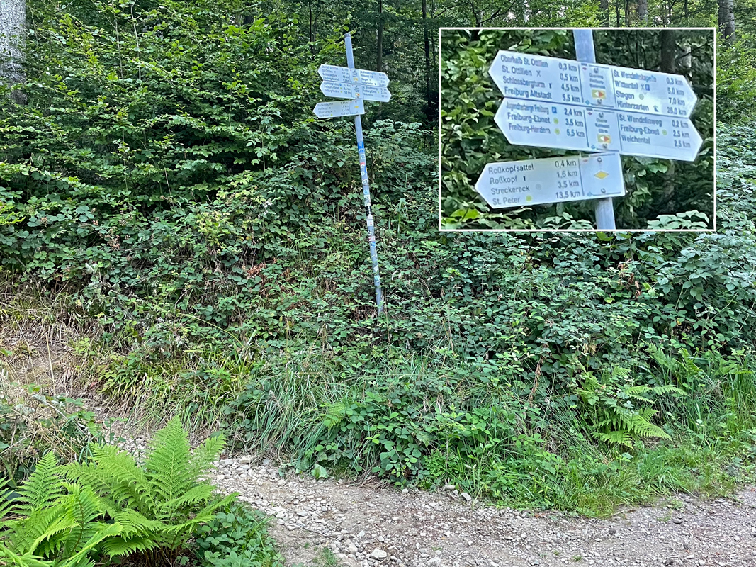 Auf dem „Husarenweg“, so zeigt es der Wegpfosten an dem breiten Forstweg – (7), von dem man kommt. Zu finden ist der Weg-Name noch auf dem Freiburger „Amt-lichen Stadtplan, Ausgabe 2010“ von 11/2009, bei der Internetsuche outet er sich als „Der Abschnitt Freiburg - St.Peter des Kandel-Höhenwegs …“ (https://freiburg-schwarzwald.de/wandern.htm, Zugriff September 2025). Auf den aktuellen Karten taucht er nicht mehr auf – also ein historischer Name?