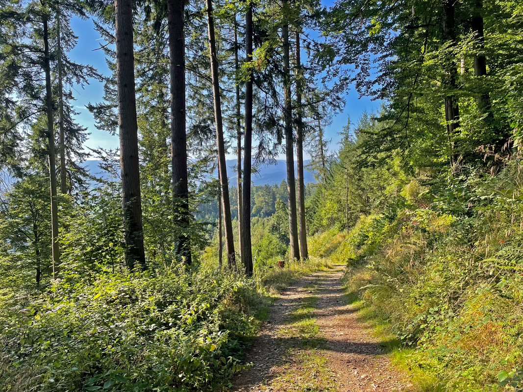 Ein Rückblick lohnt sich: zwischen den Bäumen taucht der Nordhang des Dreisamtals auf.