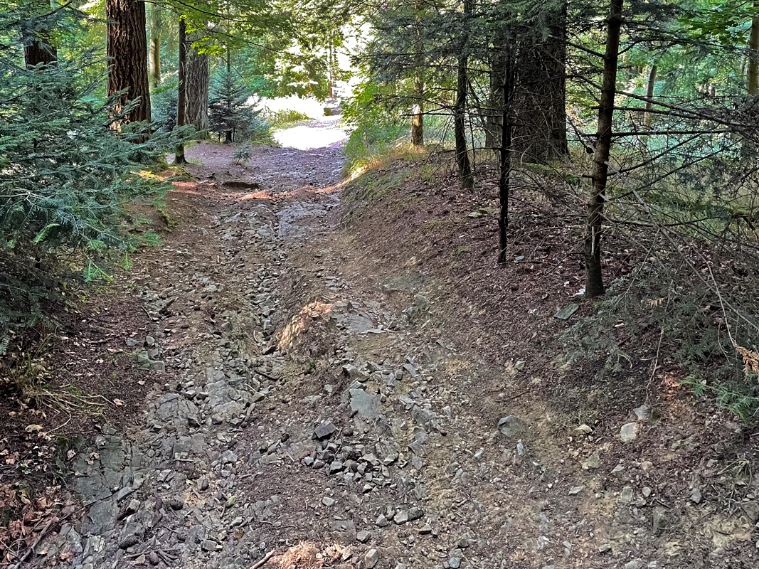 Die ausgewaschene Abkürzung hinunter zum Parkplatz am oberen Ende der Ottilienstraße ist vom Beginn der Wanderung her schon vertraut.