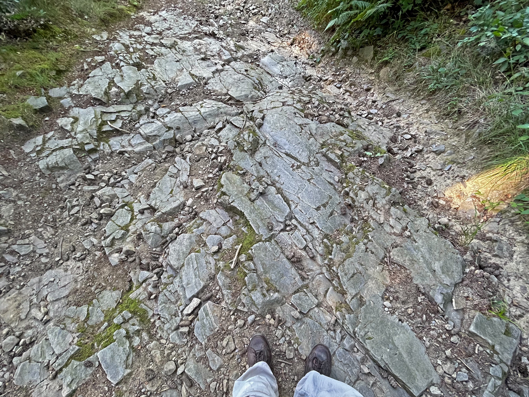 Zunächst geht es noch langsam bergab, dann steil die Falllinie hinunter: Ein Weg bei dem Trittsicherheit gefordert ist! Der Boden ist uneben, ausgewaschen, voller lockere Steine, mit glatten Stein-Passagen.