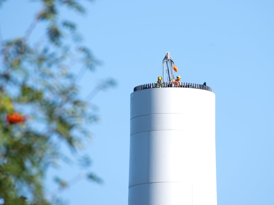 Beim Blick nach Westen sieht man in der Höhe die Spitze der zweiten neuen Windenergie-Anlage – Foto rechts, die auf der Gemarkung Gundelfingen steht. Auf dem Kopf des Turms sind schon zwei Monteure bei der Arbeit.