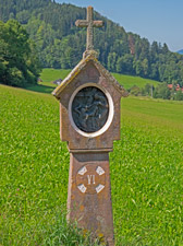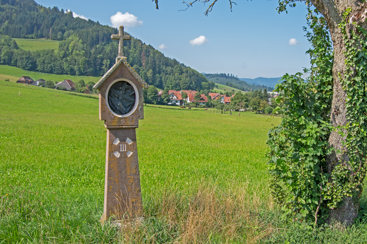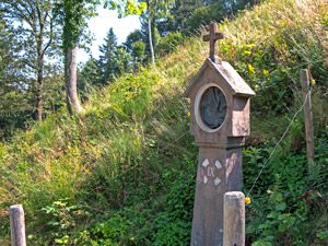 Der Hitzenhofbauer Josef Ernst gestattete „für alle Zeiten“ den Zugang zu den Stationsbildern bis hinauf zum Steinkreuz. „Die 14 steinernen Bildstöcke schuf der Steinmetz Florian Hügel aus Krozingen“. Die Stationsbilder stammten aus dem Rhonetal.
