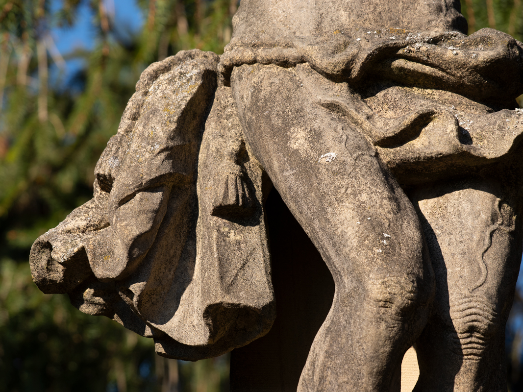 Der Sockel mit einem gestuft geschwungene Sockelfuß und einem mehrfach gestuften Deckel sitzt auf einer niedrigen, grob behauenen Steinplatte etwas über dem Boden.