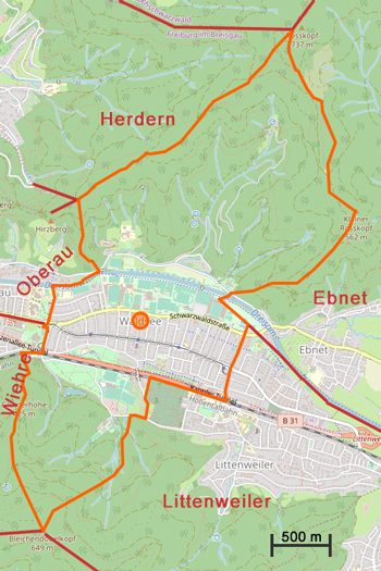 Vor dem 28.3.1939 bestand Freiburgs „Außenstadt“ aus den „Stadtteilen Freiburg-Ost, Freiburg-Nord, Freiburg-West, Betzenhausen, Günterstal, Haslach, Littenweiler und St. Georgen“, so in einer Antwort vom 25.8.1938 auf eine Anfrage des Deutschen Gemeindetags, die sich im Stadtarchiv befindet.