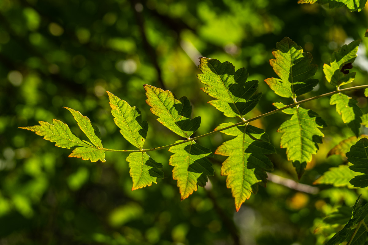 Laubblätter wechselständig, unpaarig-gefiedert bis 35cm lang mit 7 bis 15 Teilblättern. Diese sind kurz gestielte, kerbig gezähnte, eiförmige Fiederblättchen 3 bis 8cm lang, oft durch tiefere Abschnitte lappig.