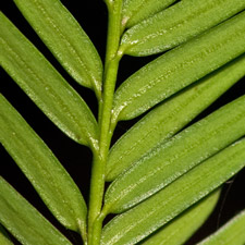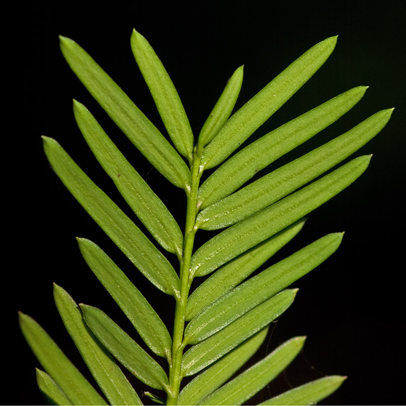 Die gestielten Nadeln sind bis 3 cm lang, laufen an den Zweigen herab. Ihre Oberseite ist glänzend dunkelgrün, die Mittelrippe läuft zur Spitze hin aus: stachelspitzig. Die Unterseite ist hellgrün mit blassen Bändern.