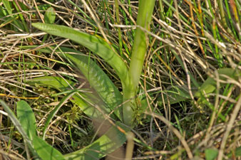 Die Blätter sind am Grunde rosettig angeordnet, lanzettlich meist spitz, bis zu 14 Zentimeter lang und bis zu 2 Zentimeter breit. Drei bis vier der Blätter umfassen den Stängel scheidig.