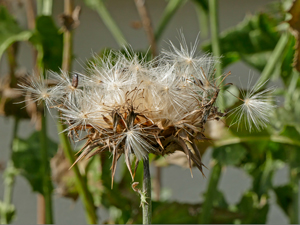 5 bis 7 mm lange Früchte (Achänen), glänzend schwarz mit braunen Flecken, sowie mit 1 bis 2 cm langem, zweireihigem Haarkranz (Pappus)