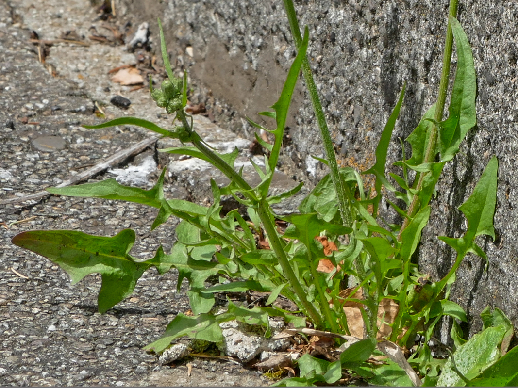 Gruppe von Kleinköpfigen Pippaus (Crepis capillaris) an einer Mauerecke (Pfl-Gruppe 1)