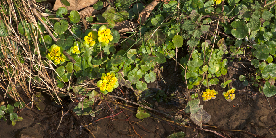 Pflanzenkolonie des Wechselblättrigen Milzkrauts (Chrysosplenium alternifolium) am wasserdurchflossenen Weggraben