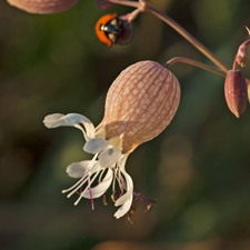 Blütenstand eines Taubenkropf-Leimkrauts (Silene vulgaris), auf seinem linken Zweig ein Siebenpunkt-Marienkäfer (Coccinella septempunctata)