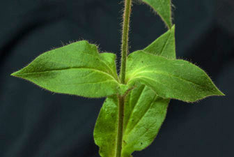 Laubblätter sitzend, ganzrandig, schmal eiförmig, zugespitzt, behaart; grundständige Blattrosette mit gestielten Laubblättern; Stängelblätter gegenständig