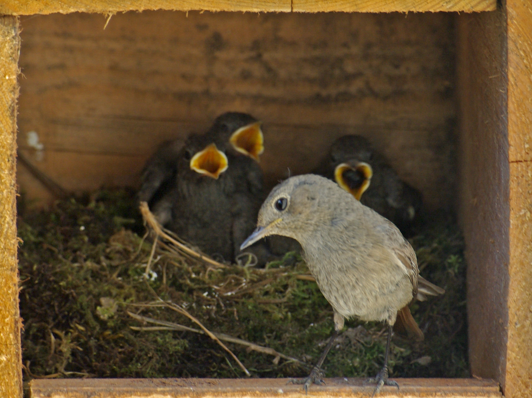 Jungvögel, fast flügge; weiblicher Vogel beim Füttern