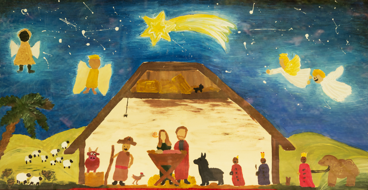 In acht Bildern, ausgestellt in den Fenstern des Gemeindesaals, lässt das A-Team – die Jugendgruppe der Gemeinde – die Weihnachtsgeschichte lebendig werden.